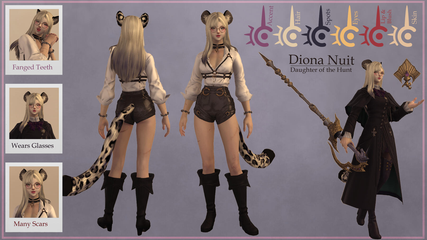 ☆ In love and war, Diona is a huntress with a fierce primal streak, and an obsession with the 'hunt.' Give her a challenge and you'll be rewarded with that same ferocity.☆ Diona adores a good meal, and will share a table with most anyone if they treat her tastebuds right. She also cooks herself, but doesn't consider herself particularly skilled.☆ Somewhere in Eorzea, Diona has a brother. She saved his life many years ago, and hasn't seen so much as the tufts of his ears since.